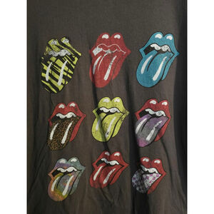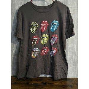This is a pre-owned, extra-large, gray Rolling Stones T-shirt. The shirt features nine colorful tongue-and-lips logo variations arranged in a grid pattern on the front. The material is 100% cotton. The shirt shows signs of wear, including slight fading and creasing throughout. There are no visible stains or tears. The shirt was made in Guatemala.