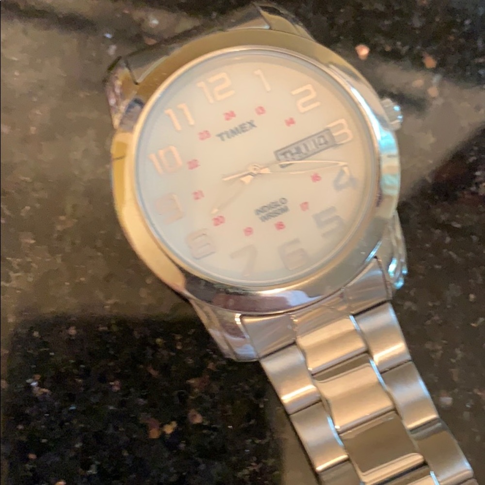 Men’s Timex watch. Natural face with day, date at 3 o’clock. Excellent condition!! Does need battery.