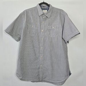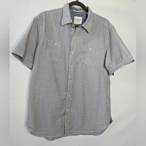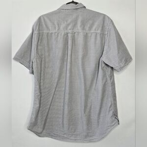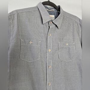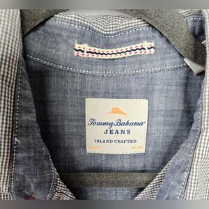 Men's Tommy Bahama short-sleeve shirt. This checkered shirt is gray and white and has two front pockets. Size large.