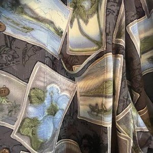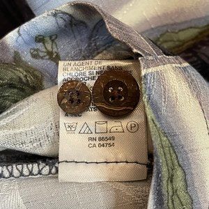 Men's Tommy Bahama gray and tropical print button down camp shirt with front pocket. 100% silk.