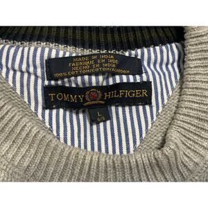 The Men's Tommy Hilfiger Sweater in size Large is a stylish and versatile addition to any man's wardrobe. Made from 100% cotton in a tight-knit pattern, this gray sweater features the iconic Tommy Hilfiger logo on the front. With a classic round neckline and long sleeves, this pullover sweater is perfect for casual occasions during the winter, fall, and spring seasons. Easy to care for with machine washable instructions, this heavyweight sweater offers a comfortable fit for everyday wear.