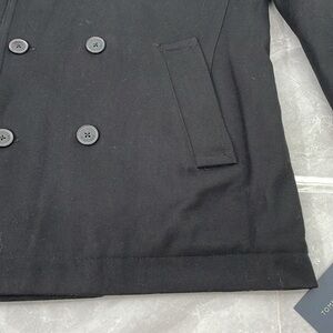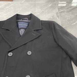 Brand new with tags - Men’s Tommy Hilfiger Wool Blend Button Pea Coat Winter Jacket. Has two outside pockets and one button closure inside pocket. Color: black. Size: L.