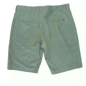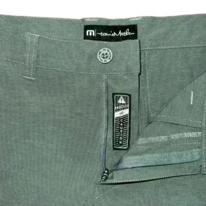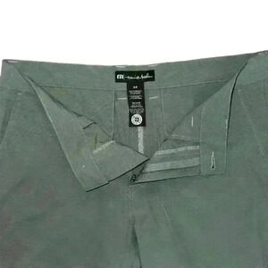 These are pre-owned TravisMathew men's shorts in a green color. They are made of a lightweight, breathable fabric and feature a button closure, zip fly, and belt loops. The shorts have two front pockets and two back pockets. The shorts are in good condition with no visible signs of wear or damage. The inseam measures approximately 9 inches. The shorts are size 34.