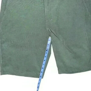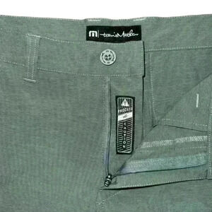 These are pre-owned TravisMathew men's shorts in a green color. They are made of a lightweight, breathable fabric and feature a button closure, zip fly, and belt loops. The shorts have two front pockets and two back pockets. The shorts are in good condition with no visible signs of wear or damage. The inseam measures approximately 9 inches. The shorts are size 34.