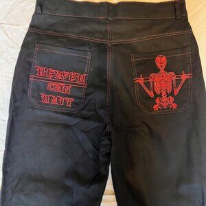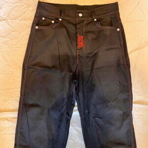 These were purchased online at Sopula and are too small for my 6'1" son. Advertised as XL but they are NOT. About 30 inches in the waist and 29 inches in length. Very light cotton material. Black with red embroidery and seamwork. Never been worn.