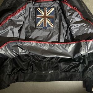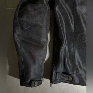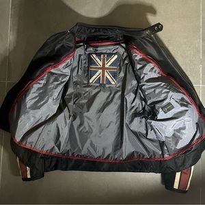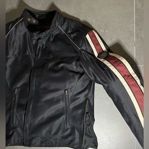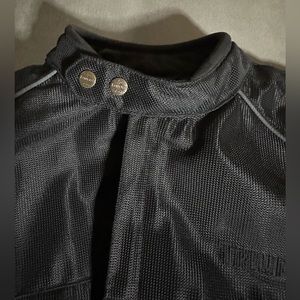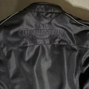 Classic Triumph racer neck biker jacket in Braddan mesh. Featuring shoulders and elbows armor, liner storage pockets and zip-out shower and windproof liner.