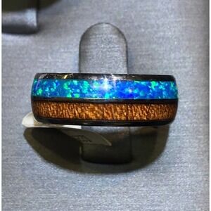 Mens Tungsten Ring Sz10.5 Black/Lab Opal & Wood Strips Unique Look New W Tags