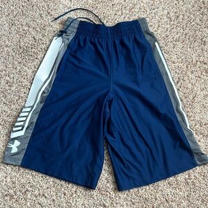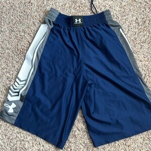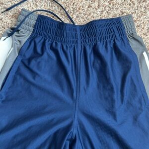 Euc men’s under Armour shorts. Navy blue with gray and white, elastic waist, drawstring. Inseam is approx 12”