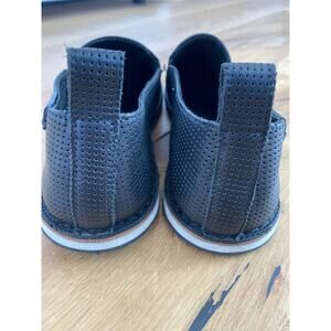Black perforated leather, rubber sole, round toe, padded footbed.