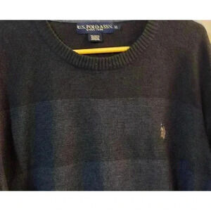 This is a pre-owned U.S. Polo Assn. men's sweater in size XL. It is a blue and black striped sweater with a crew neck. The sweater is made of 100% acrylic and is machine washable. The sweater has a small embroidered logo on the left chest. The sweater is in good condition with no visible flaws or imperfections. The sweater measures approximately 25 inches from shoulder to shoulder, 28 inches from armpit to armpit, and 28 inches from the top of the shoulder to the bottom hem.