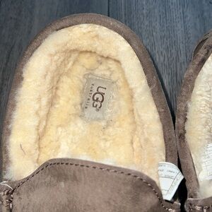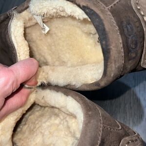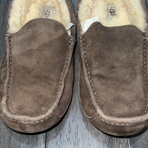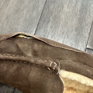 Used slippers, does have multiple markings on them as pictured however they are still very usable, still lots of use left. Does have some stitching that was removed as pictured if you are savvy with sewing and have thick threading and sewing needles for shoes it is an easy fix. Lots of fluff inside. These are very warm retail for around $130. USA size 12. I do believe these are Ascot style ugg but I’m not 100% sure