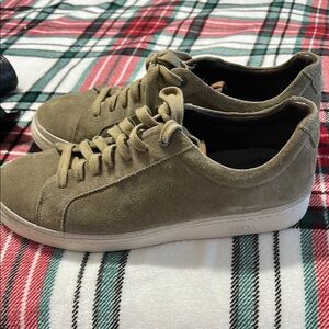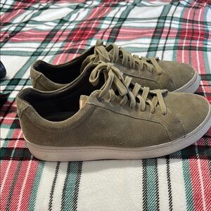 Step out in style with these tan suede sneakers. Perfect for casual outings, these shoes offer both comfort and a sleek look. they are suede with beige leather soles.