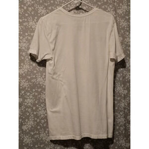 Pre-owned Dragon Ball Z t-shirt, size small. The off-white, 100% cotton shirt features a large graphic print of various Dragon Ball Z characters. The print shows minor signs of wear. Dimensions are approximately 26 inches wide and 28 inches long. The shirt has short sleeves and a crew neck. It is made by Funimation and coordinated by Studio Pierrot and Toei Animation. The condition is good, with no significant stains or tears, but some minor fading is visible on the print.
