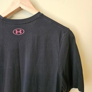 Black HeatGear loose fit logo tee from Under Armour, men's size medium. Great tee for wearing around the house, running errands, or hitting the gym. Breathable blend of 60% cotton and 40% polyester. Large logo on the front and small logo on the back of the collar.