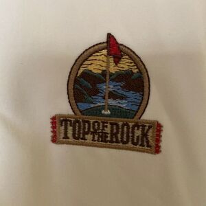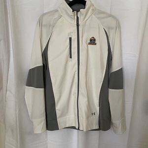 Mens Under Armour Zip-Up Golf Jacker With Fold-Away Hood & Rop of the Rock Emblem, White/Gray, Size L. Preowned in great condition. 97% polyester, 3% spandex. Measures approximately 20.5” pit to pit, 25” shoulder to hem and 30” sleeves. Good for golf, tennis, running, jogging, casual, workout
