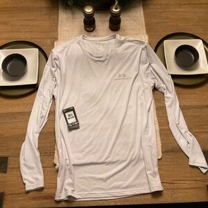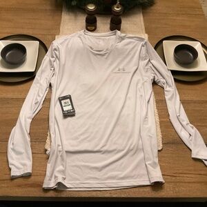 This shirt is new. I have the tag, but it snagged off, so it’s not actually attached by the plastic wire to the shirt. Shirt is still sold at Dick’s Sporting Goods where I picked it up. I ended up picking up a bigger size for myself. Size I’m selling is a Large. The shirt fits with some stretch material, but has a drape to it if you wear it a little bigger. Color is distant gray/off white. Thanks for shopping.