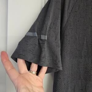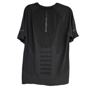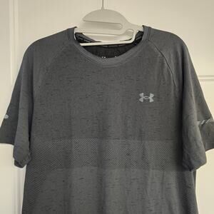 Men's Under Armour Running "HeatGear", fitted gray short sleeve athletic top. This top has reflective strips on the back and on the sleeves, the ones on the sleeves are folding in on themselves (see picture). This material does stretch.