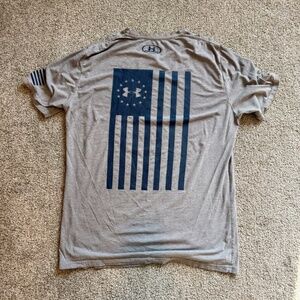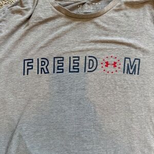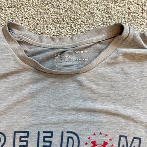 Men's Under Armour Short Sleeve Tee, M, Tee is EUC (there is some slight shadows from lighting on pic) but no signs of wear, Gray with Flag on sleeve and back and Freedom written front. Measures: 21" across chest and 28 1/2" length.