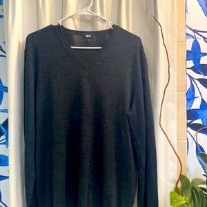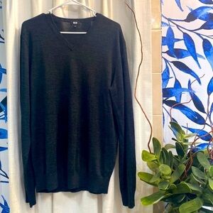 Men’s Uni Qlo Gray V Neck 100% Wool Sweater Size Large Excellent Like New Condition