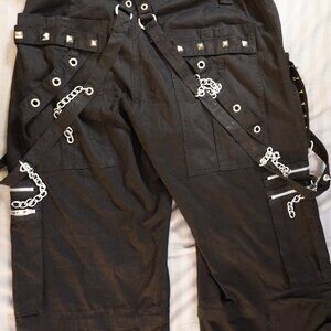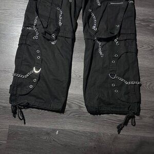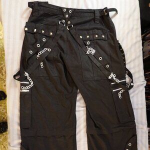 "These Tripp NYC bondage pants are a masterpiece of alternative fashion, designed to make an unforgettable statement. Crafted from a sturdy black fabric, they feature a maze of metal details that give off an industrial, punk-inspired vibe. Chains dangle from various points, adding a layer of rebellious charm, while silver-tone eyelets, studs, and D-rings enhance the look with an edge of raw attitude. The pants have multiple zippered pockets and utility straps, merging style with functionality, perfect for storing essentials or just amping up the visual drama. With adjustable drawstrings at the ankles, these pants can be customized for a tapered or relaxed fit, ensuring versatility for any style preference. Ideal for anyone who wants to embody the spirit of hardcore streetwear with a twist of dark elegance." emo goth scene rave punk pants wide leg zip off shorts excellent condition