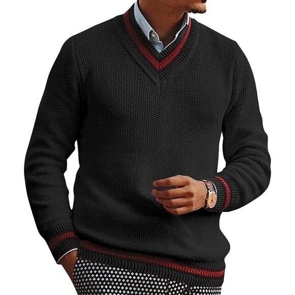 Men's V Neck Pullover Sweater Slim Fit Long Sleeve Striped Casual XXL Gift
