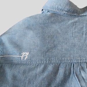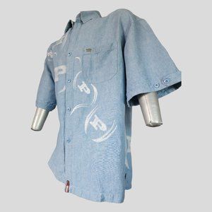 This button up vintage denim shirt is in NEW condition. Light blue denim button up with intricate white thin embroidery/stitching within the shirt. The sleeves are adjustable two different ways to tighten up. Signature Phat Farm Labels and tags. Stylish and in NEW condition. Material is 55% linen and 34% cotton. Measures 26" across the chest and is 32" long down the back. Dry clean is recommended on this classic.