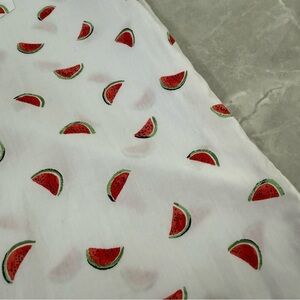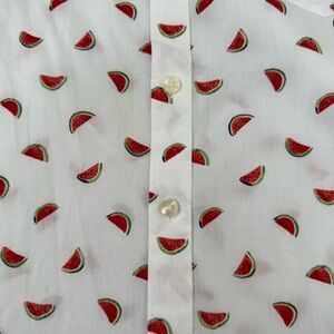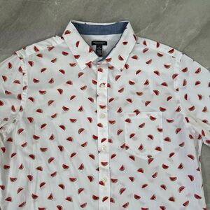 Good condition - Men’s Van Heusen Never Tuck Watermelon Button Down Short Sleeve Shirt. Has chest pocket, button down closure, slits on sleeves, and rounded slits on sides with blue insert. Colors: white, red, green, black, and blue. Size: L (16-16.5).