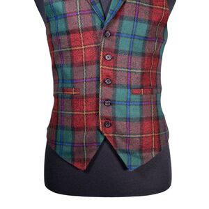 Mens Vest 40R Wool Tartan Plaid Green Red Waistcoat Formal Wedding Groom Party