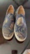 Men’s canvas Vince slip on loafers with black tan and slight muted green pattern of palm leaves. Excellent condition.