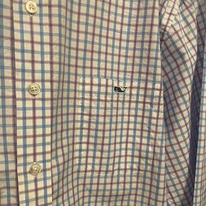 Men's Vineyard Vines Slim Fit Tucker Shirt in 100% cotton. Shirt is white and has a striped pattern in purple and blue. Collar buttons down and extra buttons are included on the inside tag. Hardly worn and in great condition. Size Men's Large.