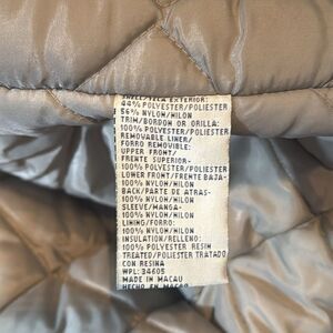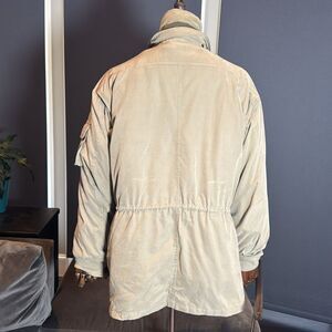 This jacket has a very soft exterior. There are lots of Pockets and Snap Closures to close the jacket, pockets and tighten the arm cuffs. The interior closes with a Zip, and can be pulled/cinched tighter with Drawstrings to keep in more warmth. There is also an interior liner that can be removed (fully zipped on) to make the jacket lighter weight for less cold weather. The removable liner would not be worn on its own, the picture of it on the dress form is just so you can see the whole interior jacket and it’s full zipper’s condition.
