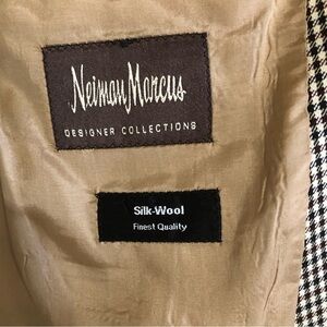 Excellent condition, Vintage Boss Hugo Boss from Neiman Marcus Silk and Wool blend Sport Coat. Small black/brown/tan check pattern. A classic! Size 40 Regular. Please check measurements in photos.