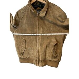 Rare tan pig suede vintage bomber jacket. Buttery soft! Brand is labeled as Crew. Very similar to a 1950s/1960 polo by Ralph Lauren style - possibly same manufacturer! Made in Korea. Wpl 9362. Lining is acrylic fleece plaid. Nylon sleeves. Polyester filling. Full zipper with two button collar. No button on exterior pockets. Some staining. Could use a professional leather cleaning, as this piece will last decades to come!