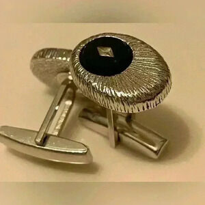 Mens Vintage Cufflinks Cuff Links #4 No Sig Silvertone Silver Tone Black Oval 3/4 by 1/2" Small shiny stone Vintage.