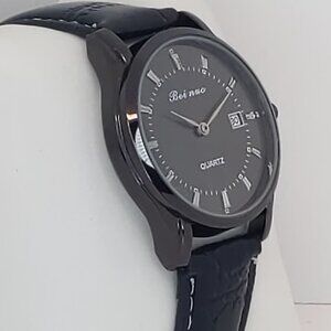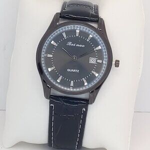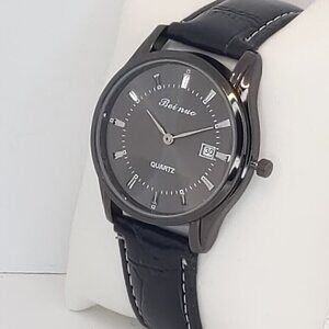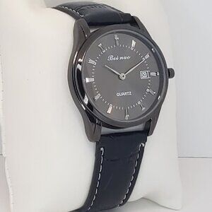 Great looking men's two hand quartz dress watch. This watch has a 40mm black case, black sunburst dial that's incredibly difficult to photograph, applied indices and a date complication. It's held in place with a black simulated alligator leather strap. This watch is new in box and works as it should.