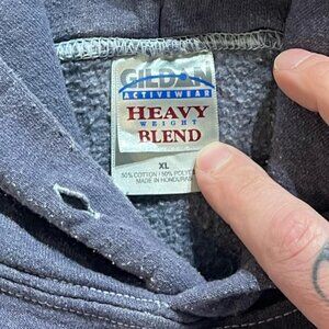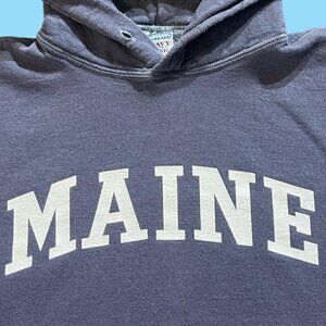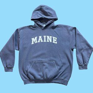 Mens Vintage Maine tourist college arch hoodie sweatshirt, grayish blue dope fade, gildan heavy blend tagged men XL and measures 25x28. Faded nicely, no rips or tears, graphic look good, washed and ready to wear, priced as personal