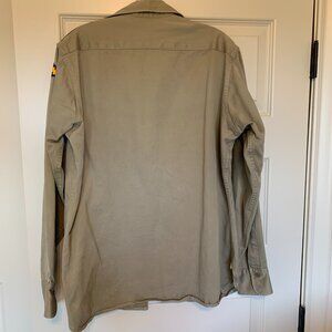Button epaulets on shoulders with two patches. Shirt-tail hem with vents. At least 75 years old.