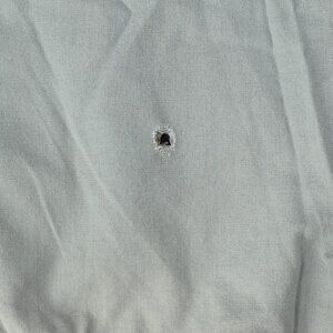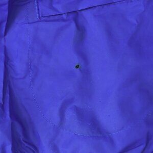 There is a small burnt hole that goes through the right jacket pocket completely, and a few small scuff marks on the snap buttons.