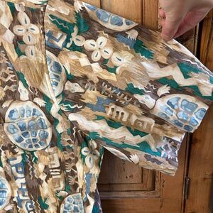 Features: Very nice 1/2 button up. Collar. Printed all over with a multi-color turtle pattern. Short sleeve. Pocket front left when wearing.