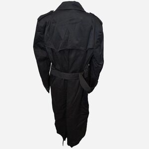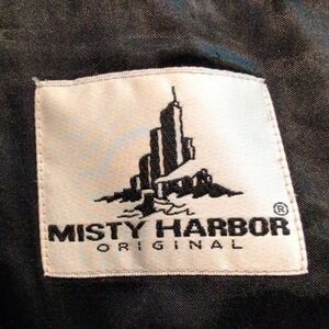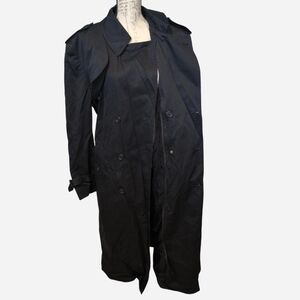 Men's black double breasted Misty Harbor lined trench coat size 42L. Faux fur lining that can be removed. Two outside pockets. Belt to cinch tight. All buttons are intact and functional. One button that holds the top flap down is loose. Has shoulder pads and rear center vent. Gorgeous vintage coat in excellent condition. No rips, tears, or stains. See pictures for care instructions. Coat is pretty heavy with the liner in place.