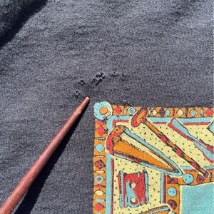 Good Condition. Pre-Owned Item. NOTE: This item is DISTRESSED- it has some minor HOLES near the corner of the screen print, AND the back of the GARMENT, SEE PICTURES.