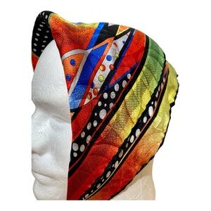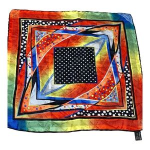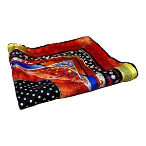 Vibrant silk scarf with geometric patterns. Features red, blue, yellow, and black colors.