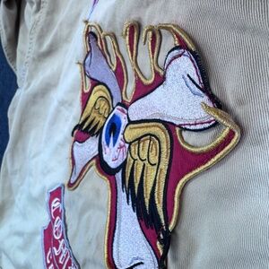 Notes on CONDITION:There are some small spots and abrasions shown in the photos with a penny for scale, and the jacket is priced to reflect those blemishes. You may be able to get the spots out on your own, and you can flatten the curled ends of the flame appliqué with a quick stitch (or some glue) but I didn't want to work on it.