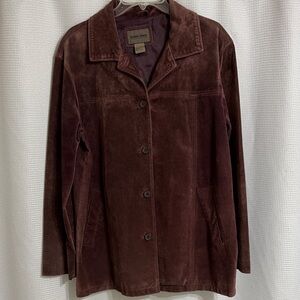This is a preowned, EUC, Vtg Brandon Thomas brown suede jacket/coat featuring a classic button-up front. 2 deep side slid in pockets. Size L. It measures 23” from armpit to armpit & is 30” long. fabric content shell is 100% leather & lining is 100% polyester.