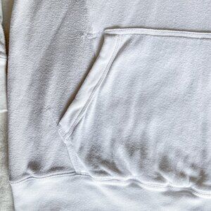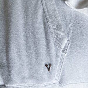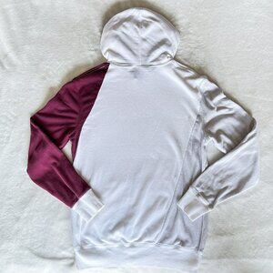 Men's Vurt brand hooded sweatshirt. White color sweatshirt with light gray sleeve and maroon sleeve. Lightweight fabric. Small "V" embellishment on lower left side of front pocket. No drawstring on hood. Front pouch pocket. Size medium. 82% cotton 18% polyester.