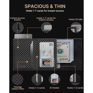 Instant card access at the tap of a button by a single hand. Stores 10-15 cards and 15 bills total. The pop-up aluminum card holder stores 6-7, the built-in cash slot stores 50+ bills, and the ID window for driver's licenses.