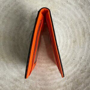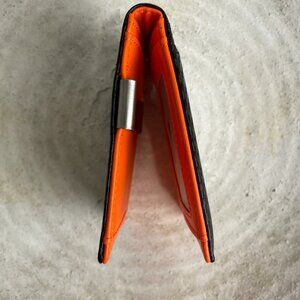 Black and orange card holder, money clip, photo window,10.5cmx7.8cm,micro fiber,synthetic leather, for a person on the move! engraving available