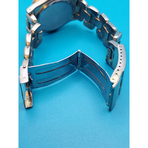 Trademark Twelve Collection 35mm Mens Quartz Watch. Silverish/Gold Toned Case,Bezel,Bracelet. Gold Dial. New Battery. Pre-owned.
