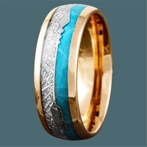 Men's Wedding Band Ring - Rose Gold Faux Blue Opal & Meteorite - Wedding Rings