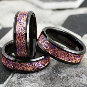 Men's Wedding Band Rings Black Rose Gold Plated Steampunk Clockwork Gears Purple